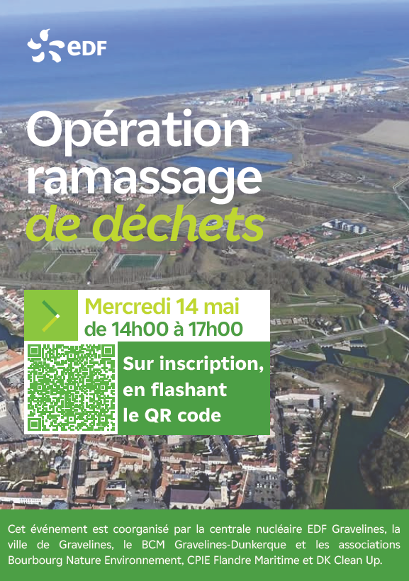 La centrale nucléaire EDF Gravelines, la ville de Gravelines, le BCM Gravelines-Dunkerque et les associations Bourbourg Nature Environnement, CPIE Flandre Maritime et DK Clean Up, vous invitent à une après-midi engagée et conviviale : un grand ramassage de déchets, ouvert à toutes et tous, à partir de 5 ans !